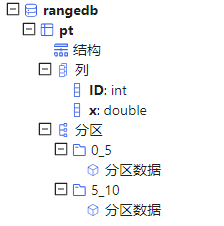 在下面的例子中,数据库 db 有两个分区:[0,5) 和 [5,10)。使用 ID 作为分区列,并使用函数 append!