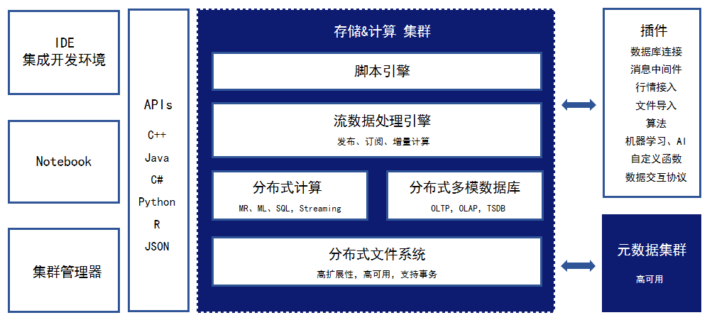 不同的存储引擎在数据存储、读取和写入上存在差别,都为适应海量结构化数据的不同存储、检索、分析和计算场景而设计。如 OLAP 引擎主要应用于扫描分析大量数据,适用于查询整个分区或整列数据全表扫描的场景,而 TSDB 引擎则在单点查询等场景下性能优越。无论使用何种存储引擎,用户均可通过 DolphinDB 的脚本引擎、流数据引擎及分布式计算框架对存储数据进行高效处理。