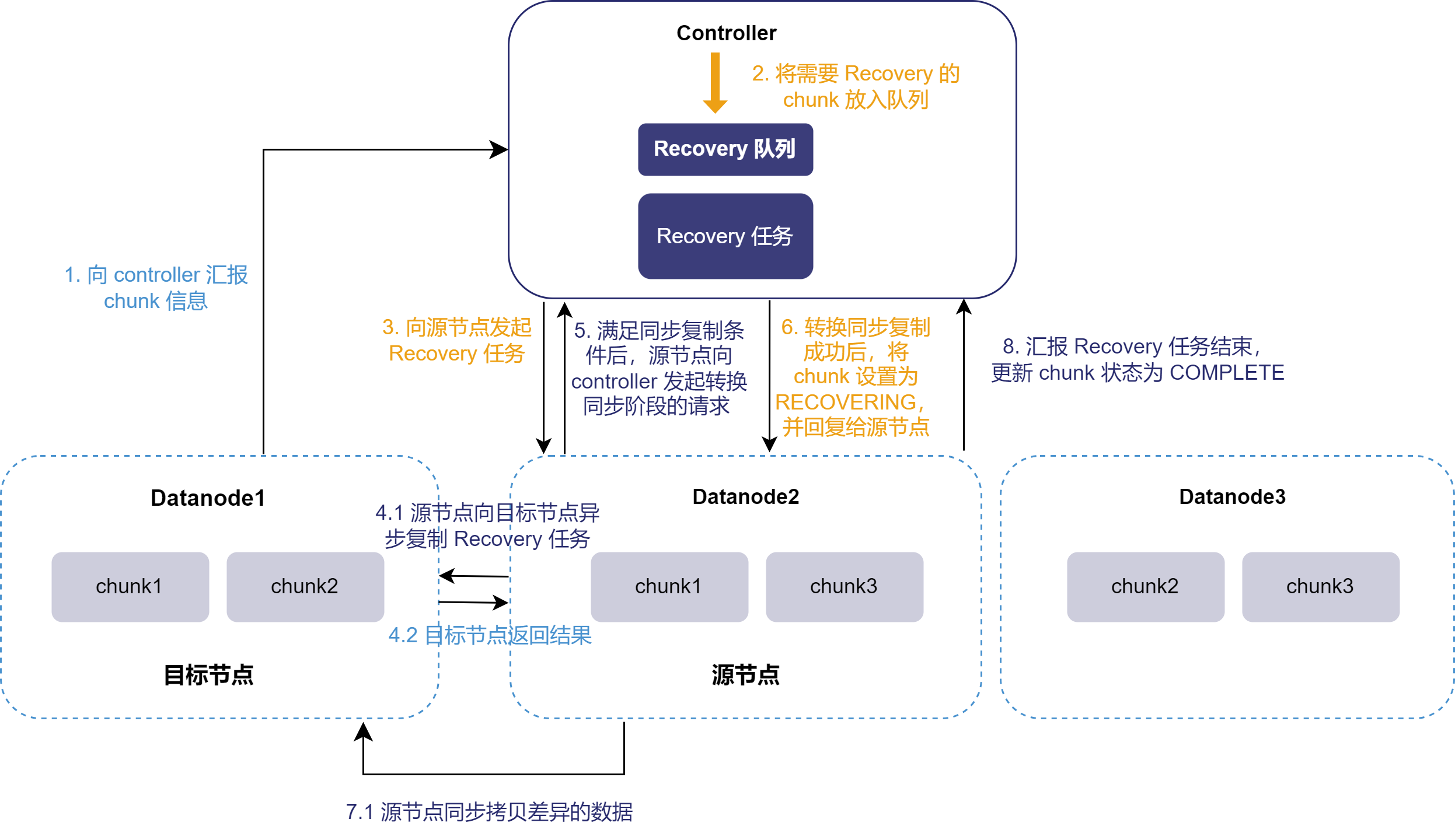 以包含一个控制节点和三个数据节点的集群为例。该集群副本数为2,Datanode1 从故障中恢复。通过图示展示 Online Recovery 的过程: