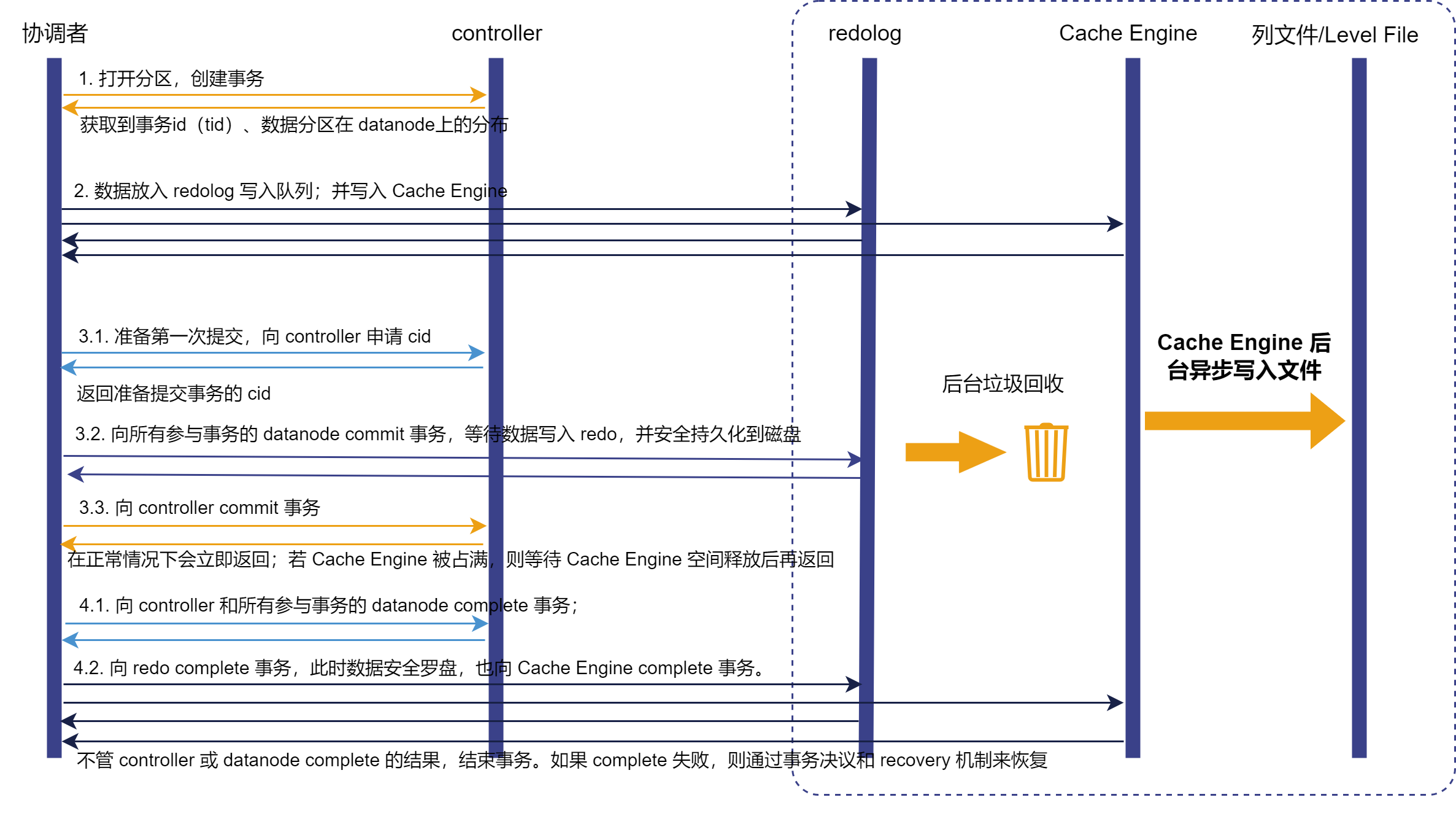 Cache Engine 是 DolphinDB 中的一种数据写入缓存机制。数据在写入 Redo Log 的同时写入 Cache Engine。在 Cache Engine 中的数据累积到一个阈值或者达到一定时间后,再由 Cache Engine 一次性异步写入数据文件。在一个事务涉及多个分区且数据量较小的情况下,如果每次事务结束都立即写入磁盘,写入效率将会受到影响。而利用 Cache Engine 先将这些事务缓存起来,待累积到一定数量后,以批量的方式一次性写入磁盘,则可以提供较高的压缩比此外,批量顺序写入也有助于提高IO吞吐量,从而有效提升整体系统性能。