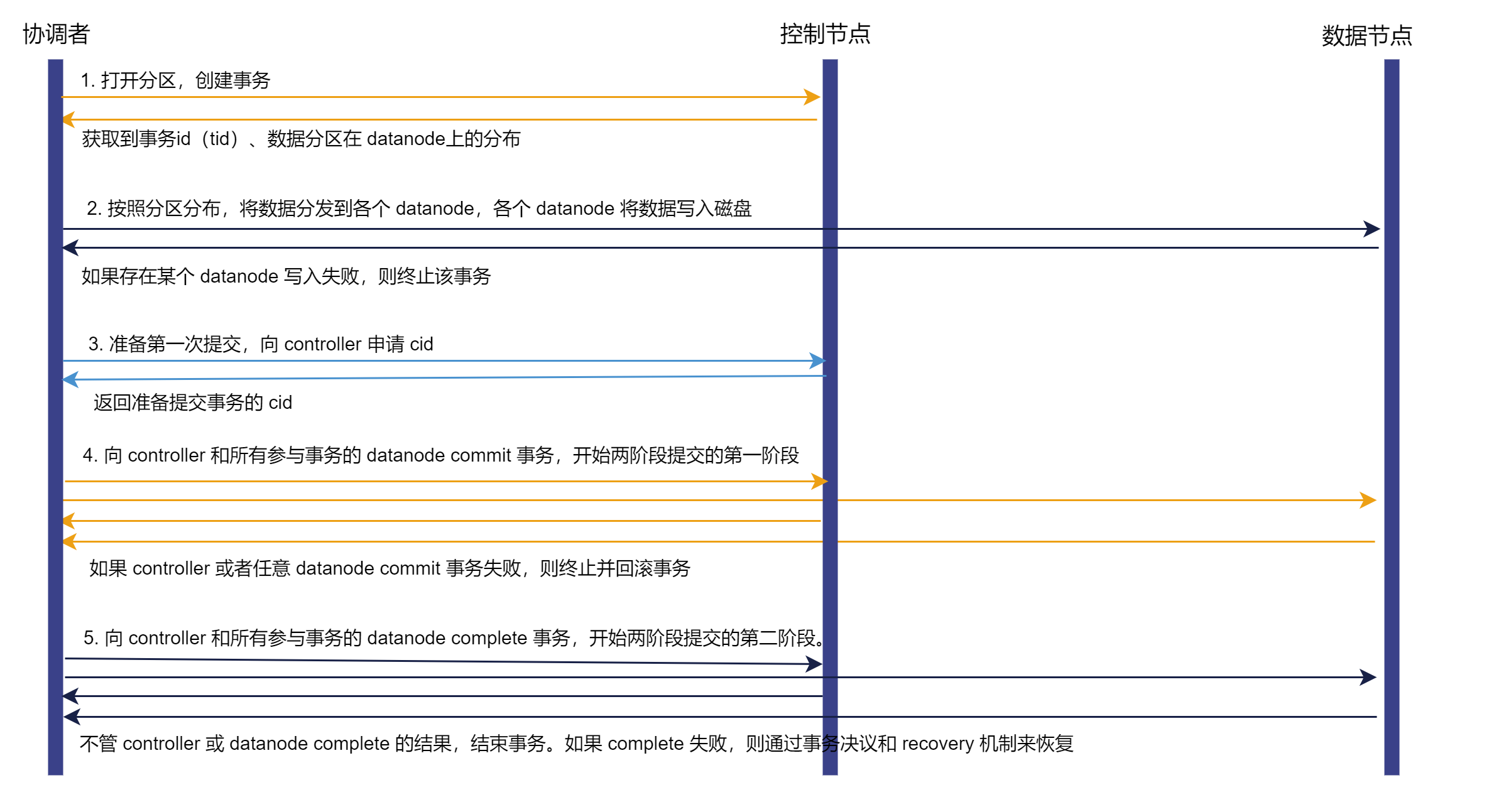 DolphinDB 采用两阶段事务提交机制,每次由事务的发起节点作为协调者(coordinator)推进整个事务的执行流程。