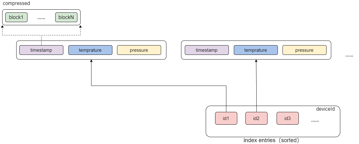 假设 sortColumns 指定了 n 个字段,则系统取前 n-1 个字段的组合值,作为索引键 sortKey,每个 sortKey 值对应的数据按列存储在一起(如下图,假设 sortColumns 为 deviceId 和 timestamp)。