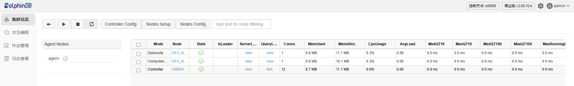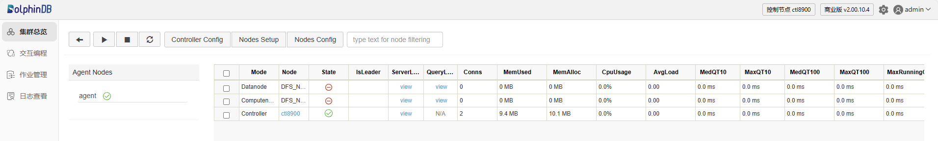 以管理员身份(默认账号:admin ,默认密码:123456)登录 Web 管理界面后,点击 Mode 列左边的复选框全选或选择部分数据节点和计算节点,然后点击 ▶ 启动选中的节点。再点击 🔄,我们可以发现,选中的节点已经启动。