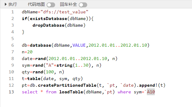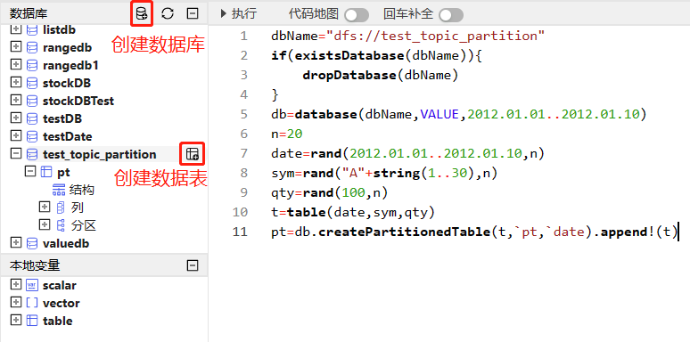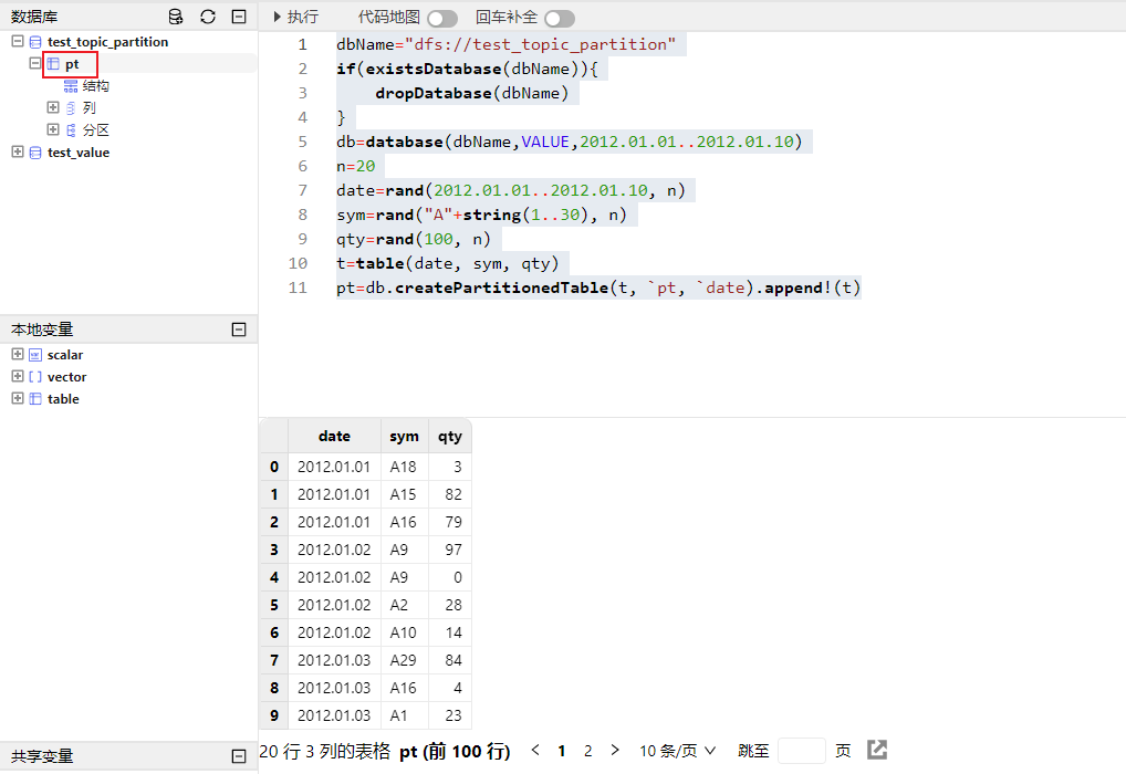 例子:在编辑器中输入并执行以下代码,创建分布式表 pt。