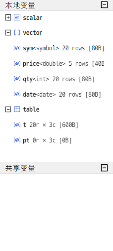 通过点击变量浏览器的向量/矩阵/内存表,可在数据浏览器查看其数据。分布式表的数据请通过数据库浏览器查看。