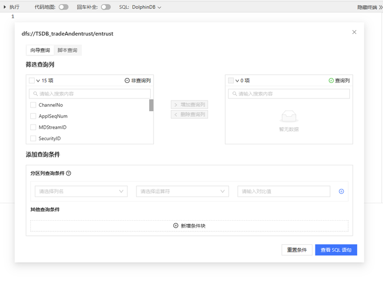 若当前表中存在分区列,则用户须至少填写一个分区列查询条件。分区列的查询条件间只支持“且”的逻辑关系。