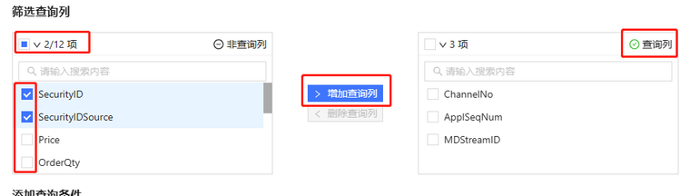 在左边的非查询列中,用户可勾选列名前的方框以选择一个或多个列;亦可点击项目数前的方框以实现全选;