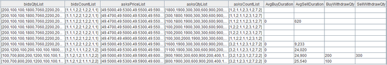 | prevBuyWithdrawQtyList1 | LONG[] | 价格为上一笔快照的 BuyPrice1,在当前周期内的撤单明细 |