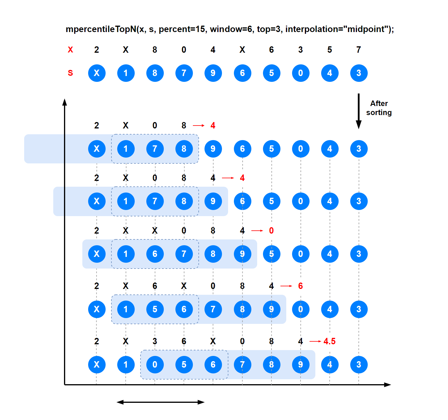 下图以 mpercentileTopN(x, s, percent=50, window=6, top=3, interpolation="midpoint"); 为例,展示函数的计算过程。
