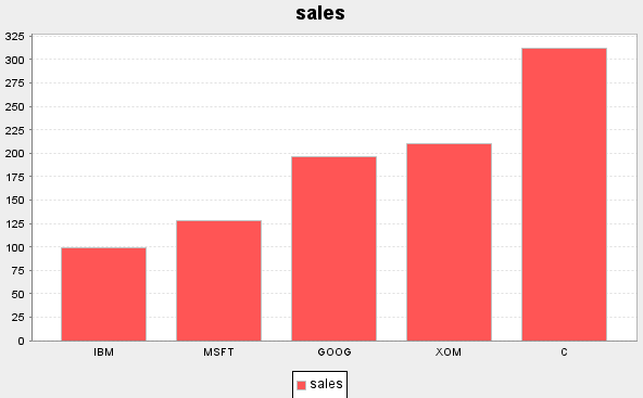 plot(99 128 196 210 312 as sales, `IBM`MSFT`GOOG`XOM`C, `sales, COLUMN)