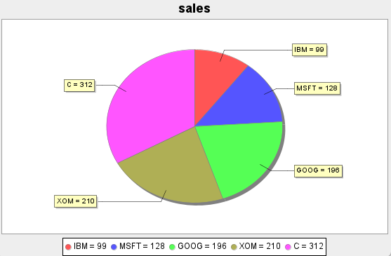 plot(99 128 196 210 312 as sales, `IBM`MSFT`GOOG`XOM`C, `sales, PIE)