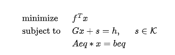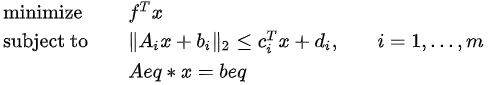 该函数用于求解二阶锥规划问题,计算目标函数在限定条件下的最小值。若其约束条件以标准形式给出,其形式如下: