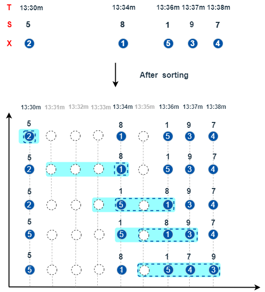 以下图为例,在滑动的时间窗口内,将 X 的元素根据 S 的升序排序后,取前 3 个元素进行计算。
