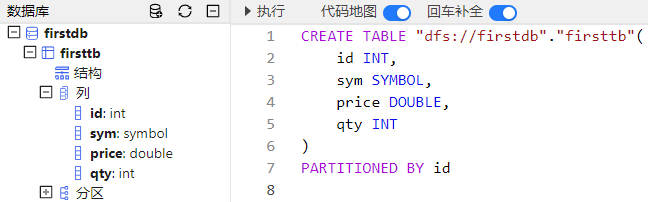 CREATE TABLE "dfs://firstdb"."firsttb"( id INT, sym SYMBOL, price DOUBLE, qty INT ) PARTITIONED BY id由此,在 firstdb 数据库中创建了名为 firsttb 的数据表。其中分区条件为 id。