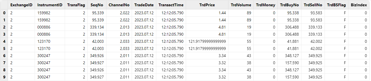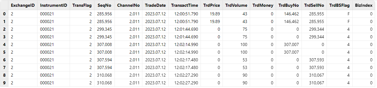 • 深交所逐笔成交:流数据表名称为 ”nsqStockTradeSZStream"。