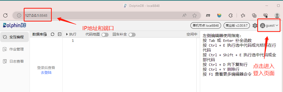 • 第四步:打开浏览器,在地址栏输入 DolphinDB server 的 ip 地址与端口,连接到该节点的 web 编辑页面。点击右上角的用户按钮进行登录。