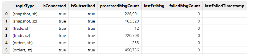 iniNsqEnv(["myNsqOrdersSHStream", "myNsqOrdersSZStream", "myNsqTradeSHStream", "myNsqTradeSZStream","myNsqSnapshotSHStream", "myNsqSnapshotSZStream"])