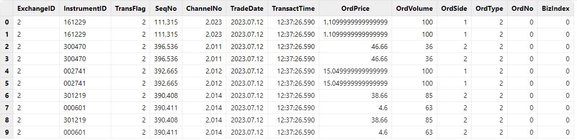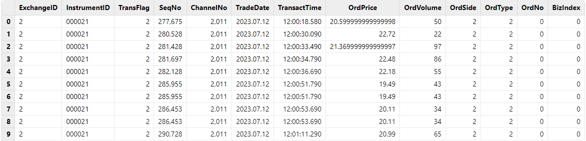 • 深交所逐笔委托:流数据表名称为 ”nsqStockOrdersSZStream"。