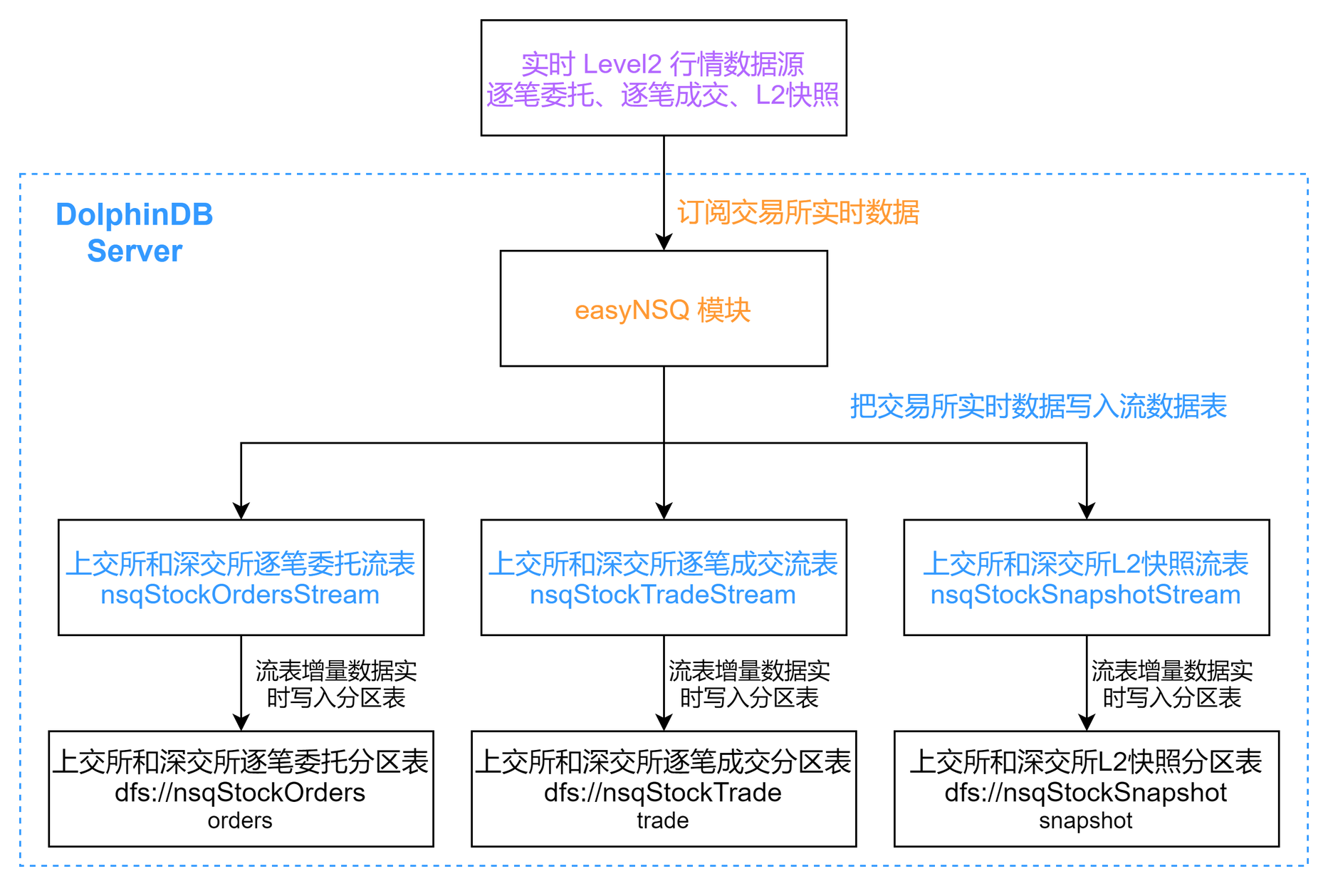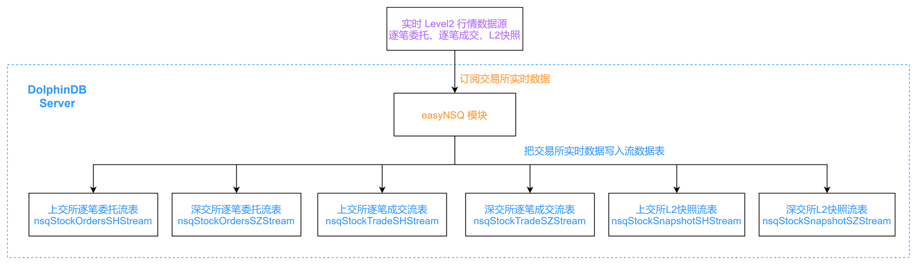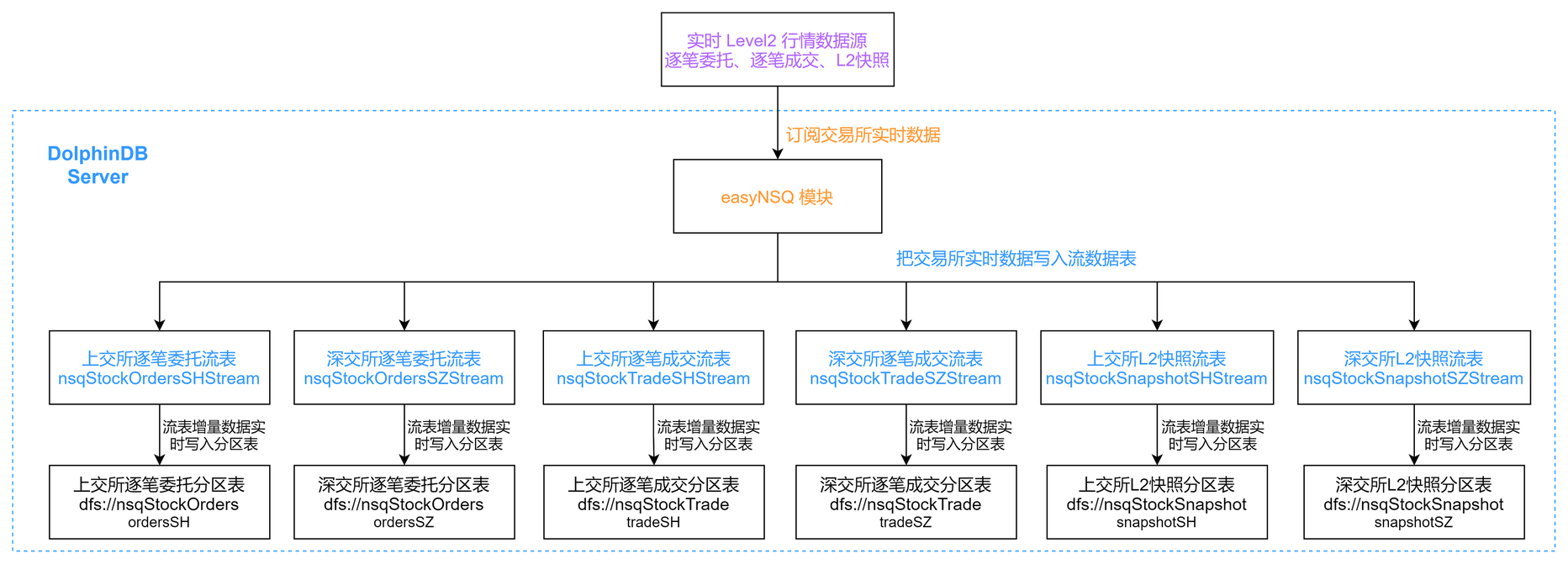 用户指定希望接收的行情数据源(逐笔委托、逐笔成交或L2快照),easyNSQ 模块会根据用户的需要创建不同的持久化共享流数据表,并通过 NSQ 插件订阅交易所数据,将上海和深圳市场的实时行情数据写入持久化共享流数据表中。