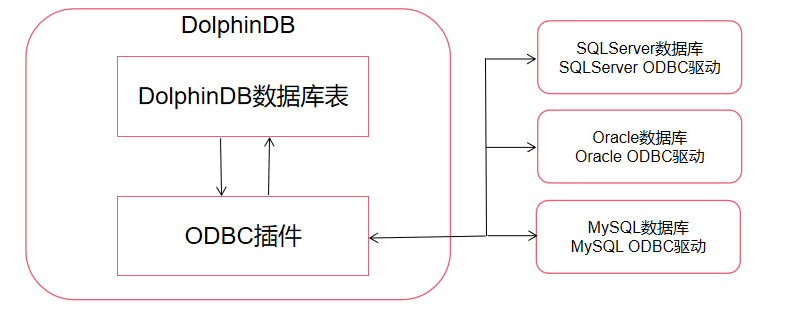用户可以使用 DolphinDB ODBC 插件连接其它数据库服务,将其他数据库中的数据导入到 DolphinDB 数据库,或将 DolphinDB 内存表导出到其它数据库,也可以从 DolphinDB 分布式表中取出数据获得内存表,然后将该内存表导出到其他数据库中。在 DolphinDB 中使用 ODBC 插件查询和写入外部数据库的交互关系如下图所示: