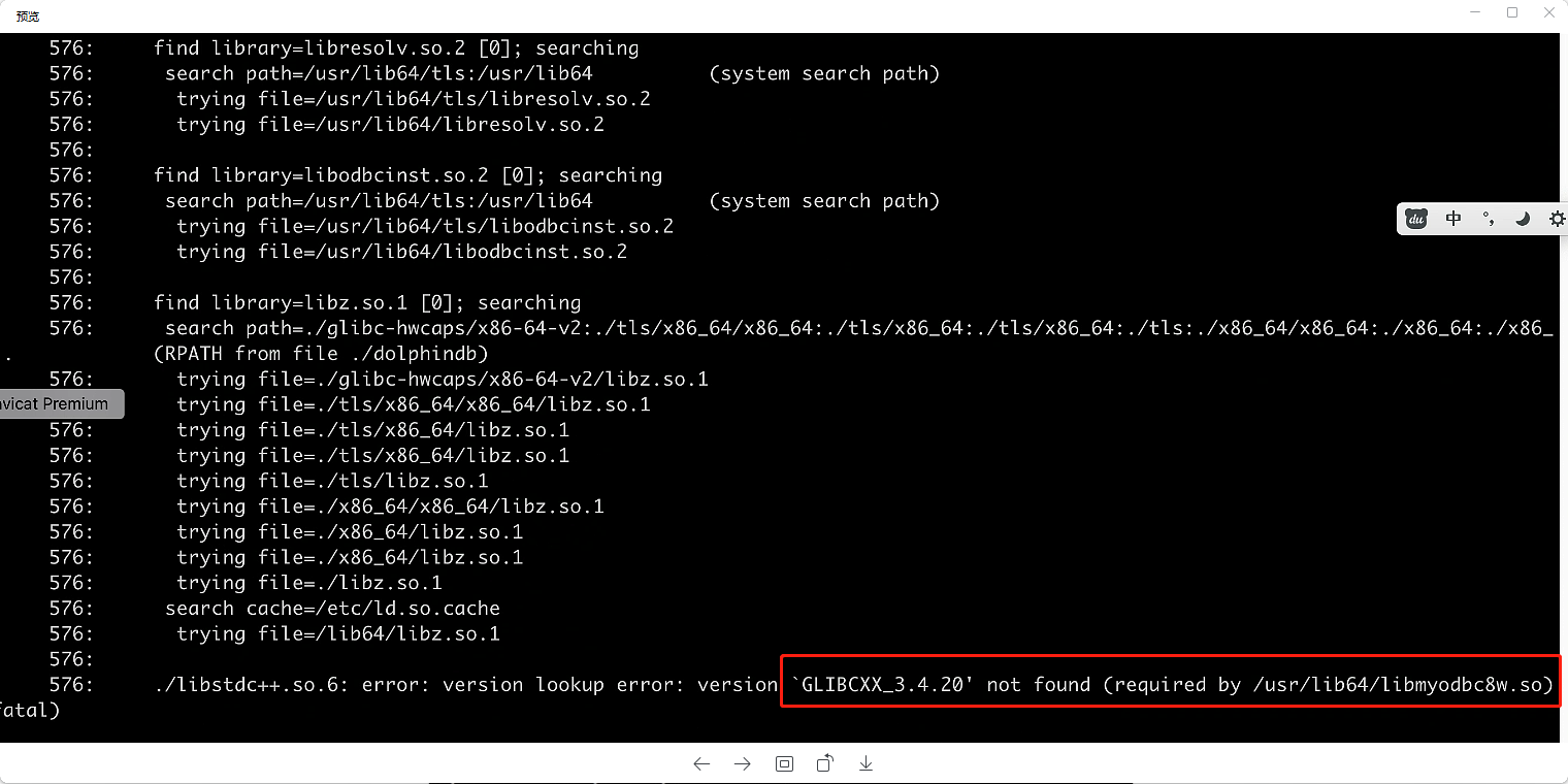 如果出现了 glibcxxx not found 的报错,原因是运行的 ODBC 驱动或者是其依赖库对 glibc 的版本过高。通常建议是使用 glibc 版本低的系统编译好无法运行的库或者下载合适版本的库,通常不建议直接升级 glibc,因为 glibc 是系统底层库,可能会对一些系统工具造成影响。