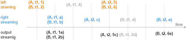 与 SQL 中的 equi join 不同的是,因为引擎内部并不缓存所有历史数据,所以可能出现左表(或右表)中的某条记录到来后无法关联到已经从引擎缓存中清除的历史右表(或左表)记录,进而不会输出结果。这是由 equi join 引擎的设计初衷和内部实现决定的,该引擎是为以连接列和时间列为键值的输入数据设计的,比如每支股票在每分钟有一条记录。