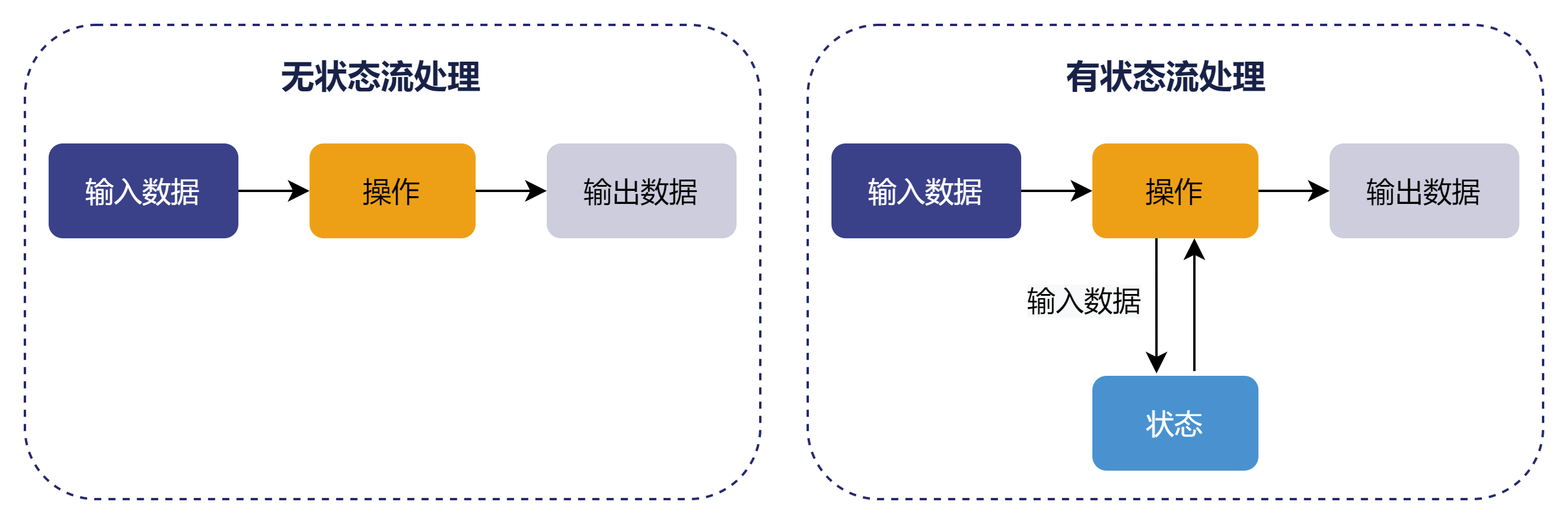 流数据处理分为无状态和有状态两种方式,下图展示了无状态流处理和有状态流处理的主要区别: