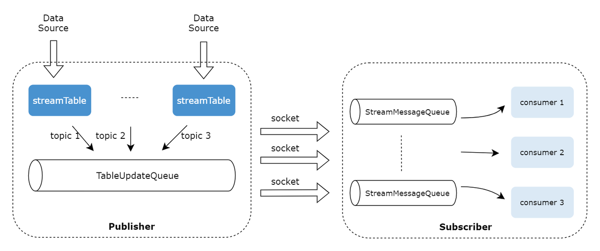 DolphinDB 采用了经典的发布-订阅(Pub-Sub)通信模型,通过消息队列实现流数据的发布与订阅,将流数据生产者(发布者)与消费者(订阅者)解耦。这种模式促进了系统内不同组件之间的通信,提高可伸缩性,改善发送者的响应能力。