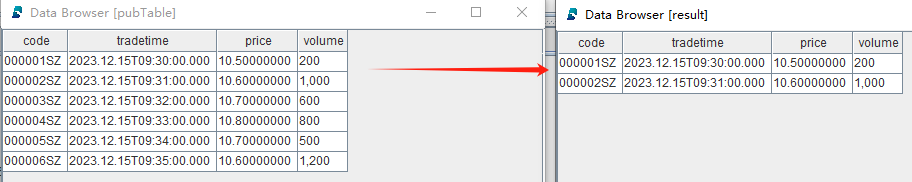 tableInsert(pubTable, "000006SZ", 2023.12.15T09:35:00.000, 10.6, 1200)查看发布端的流数据表 pubTable 和订阅端的过滤后的数据表 result: