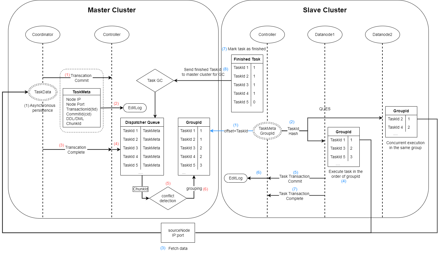 (3)若数据节点检测到该任务为写操作,则根据元数据中主集群节点的 ip:port,将任务的数据从主集群拉取到本地。