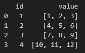 'value': [np.array([1,2,3],dtype=np.int64), np.array([4,5,6],dtype=np.int64), np.array([7,8,9],dtype=np.int64), np.array([10,11,12],dtype=np.int64)]