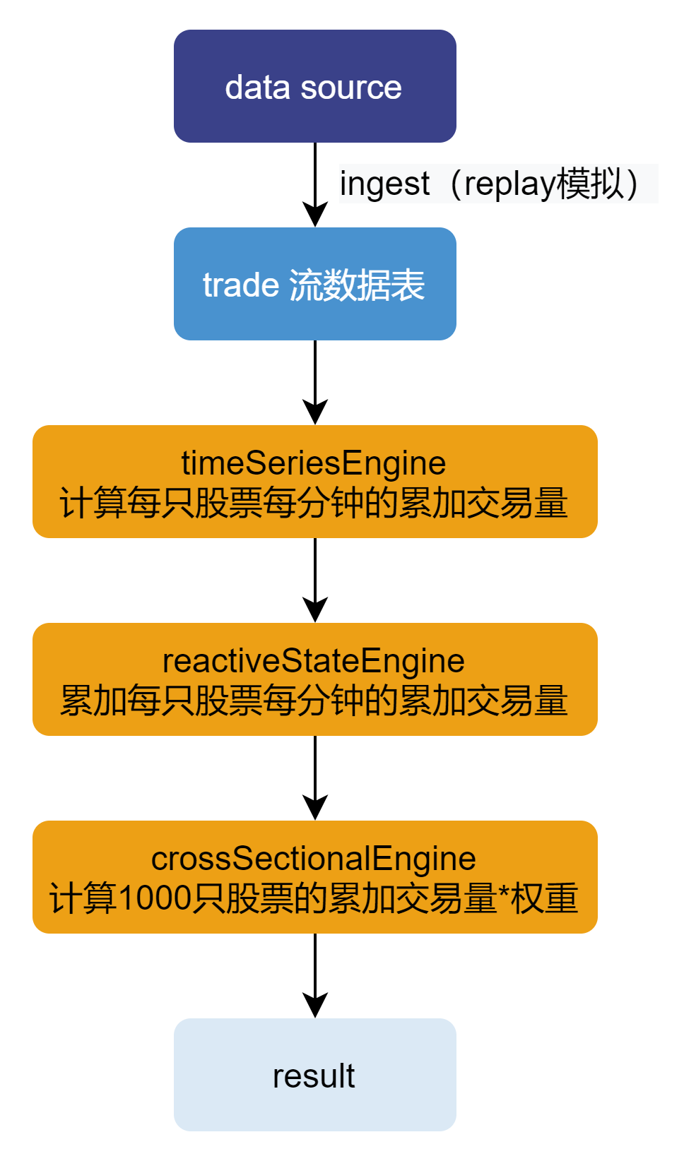 trade 表的数据将作为数据源注入“计算每个股票每分钟的交易量”章节中创建的时间序列引擎 tsEngine 中。