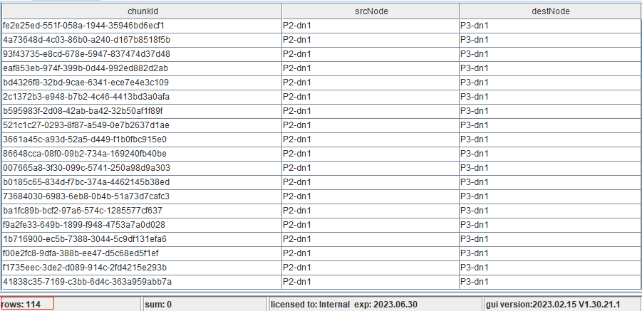 rpc(getControllerAlias(), rebalanceChunksAmongDataNodes{ false })返回预估分区迁移结果,如图所示,预估 P1-dn1、P2-dn1 共有114个分区迁移至 P3-dn1。