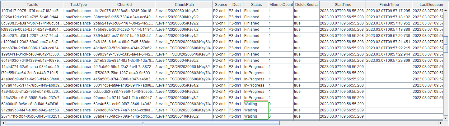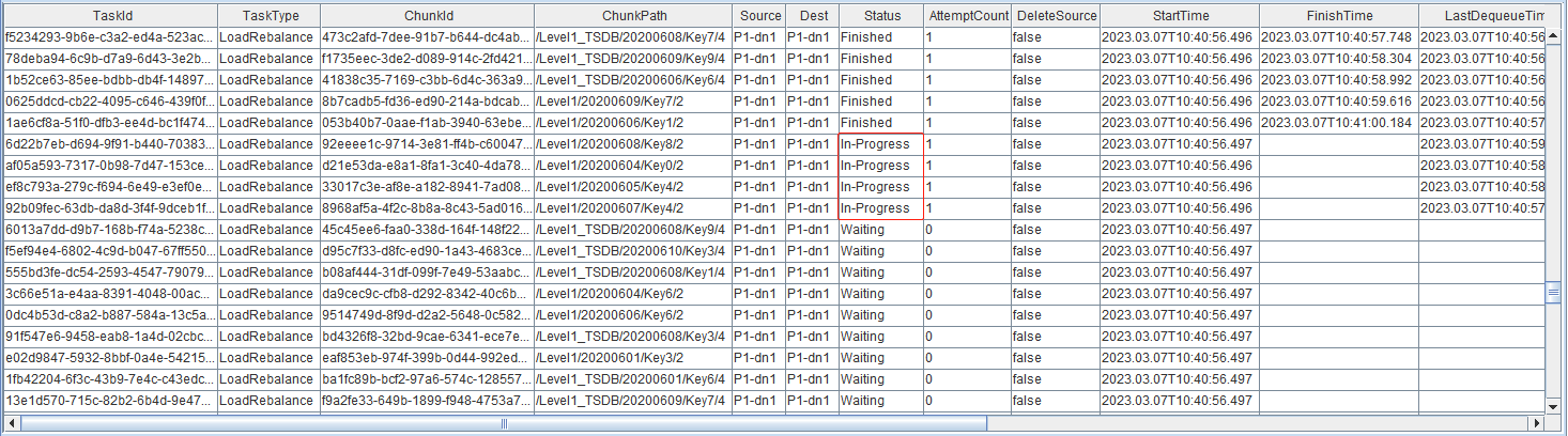 Status字段为 In-Progress 的任务数目表示控制节点发起任务时的并发度,通过 dfsRebalanceConcurrency 参数配置,默认为数据节点个数的两倍。recoveryWorkers 参数表示数据节点执行任务时的并发度,默认为1。