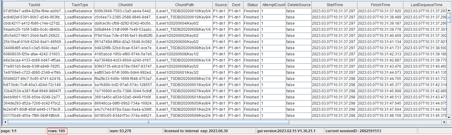 从图中看,两次再平衡共计迁移189个分区。可以看到,DeleteSource 字段全部为 False,原因为对于数据节点内部分区迁移,从旧盘到新盘,分区仍然是在同一个数据节点,所以该参数一直为 False。