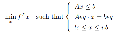 min 表示求表达式 fTx 关于 x 的极小化,such that 后面的内容表示约束条件,在大括号内的三个式子表示相应的等式约束和不等式约束。可以观察到上述表达式关于 x 都是线性的,这种目标函数和约束条件都为线性的优化问题被称为线性规划问题。