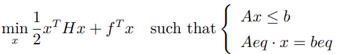 其中 H 必须是对称正定矩阵。可以观察到与线性规划问题相比,该模型中的目标函数中多了关于 x 的二次项。