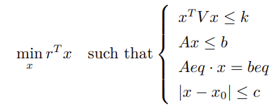qclp 全称为 Quadratically Constrained Linear Programming,即二次约束线性规划,该函数用于求解线性目标函数在包含二次约束条件下的极值。