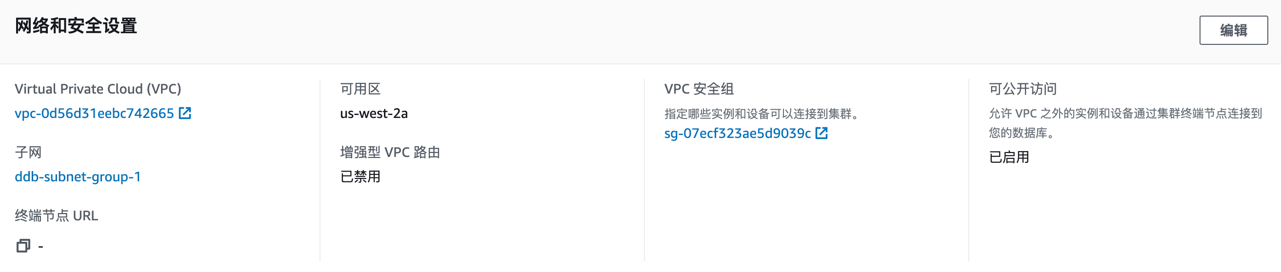 编辑集群的属性,修改网络和安全设置,设置 VPC 安全组为刚才创建的安全组,并启用可公开访问。