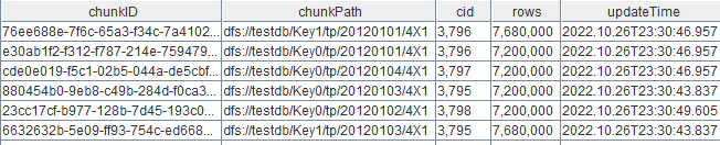 getBackupList 会返回一个分布式表的备份信息。返回为一张表,表里包含备份文件里这个表的所有的分区。每个分区对应表中的一行。表中会有chunkID、chunkPath、版本号、每个分区包含的行数和最后一次更新的时间戳。