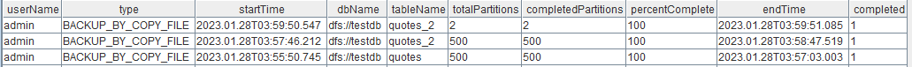 - 返回的表里对每张表的备份/恢复任务都有一行新纪录。例如上图的表里返回了两条记录,虽然只进行了一次备份