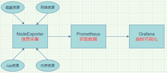 本方案主要用于监控服务器资源使用情况,如 CPU 频率信息、内存占用信息、磁盘 IO 信息、网络 IO 信息等。本方案由 NodeExporter 采集服务器指标,Prometheus 定时抓取,再由 Grafana 对 Prometheus 采集的资源信息进行可视化展示。