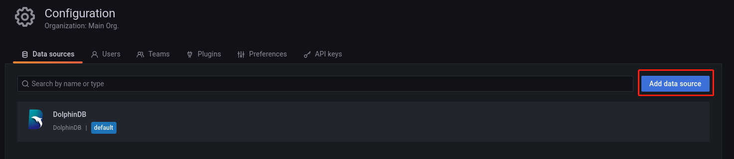 修改配置文件之后,需要重启Grafana服务。重启后,在Grafana中添加dolphindb-datasource数据源,在搜索框输入DolphinDB,然后点击下方出现的结果,如下图所示: