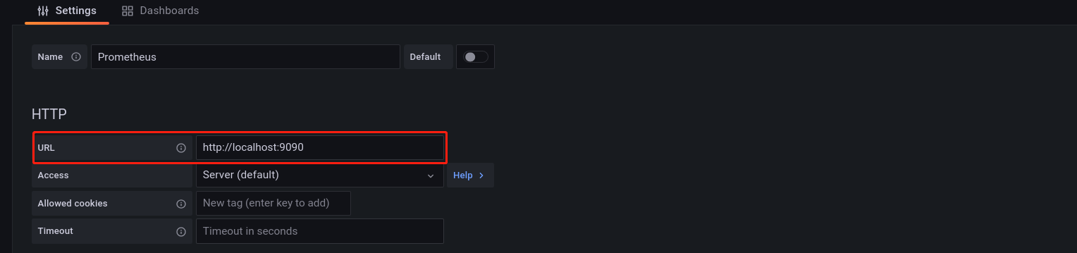 在 URL 上配置 Prometheus 对应的IP和端口(其他选项设置默认),然后点击下方的 Save&test,若出现了 Data source is working 就说明数据源连接成功(若连接失败,检查Prometheus端口是否被占用)。