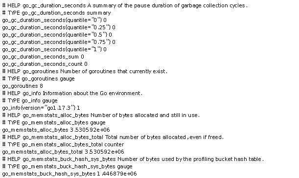 $ nohup ./node_exporter --web.listen-address IP:Port &访问 http://IP:Port/metrics,可看到当前 NodeExporter 获取到的当前服务器的所有监控数据,如下所示: