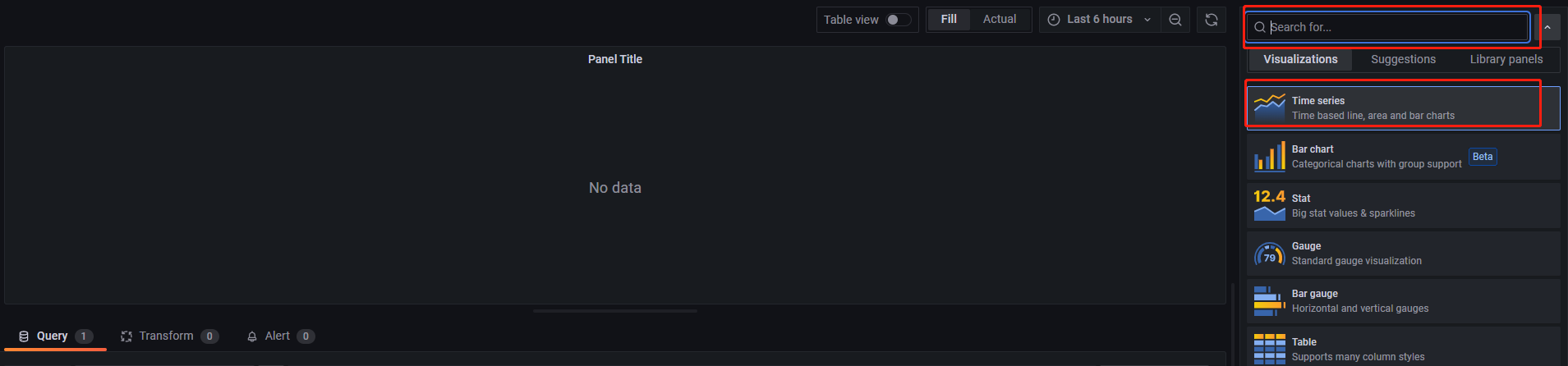 select * from t注意:返回的结果的形式必须为一张表。若想将结果展示为 Graph,可以点击右侧的 Visualizations,点击红色方框处下拉列表,选择 Time series,如下图所示: