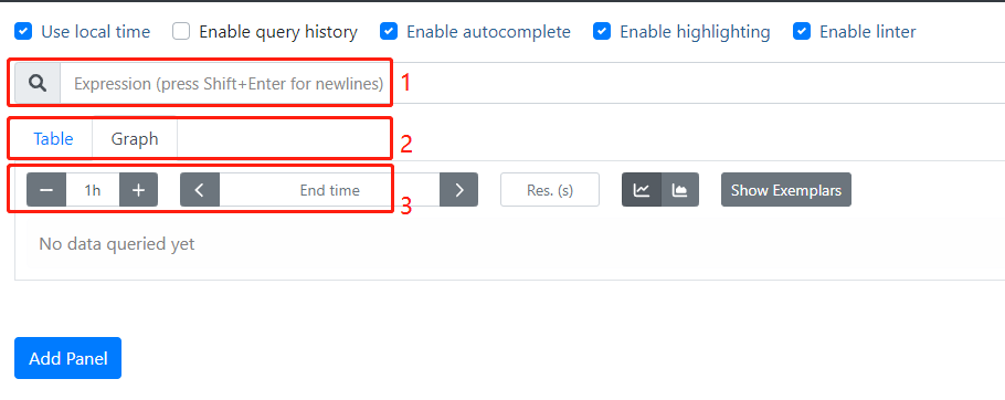 上图中1为命令行,可在其中输入 PromQL 语句进行查询,不仅支持简单的指标查询,还可以对指标进行运算;2为指标的展示形式,可将指标展示为图或表,所有指标都可以以表的形式展示,部分指标可以以图的方式展示;3为展示指标的的时间范围。
