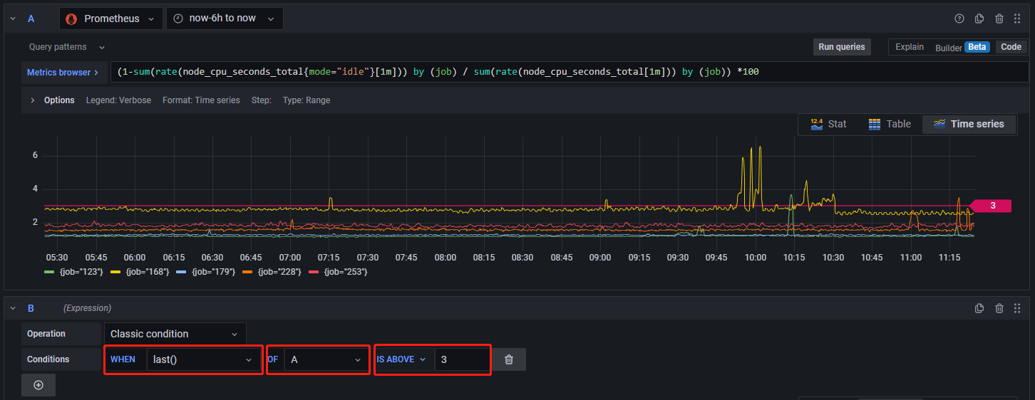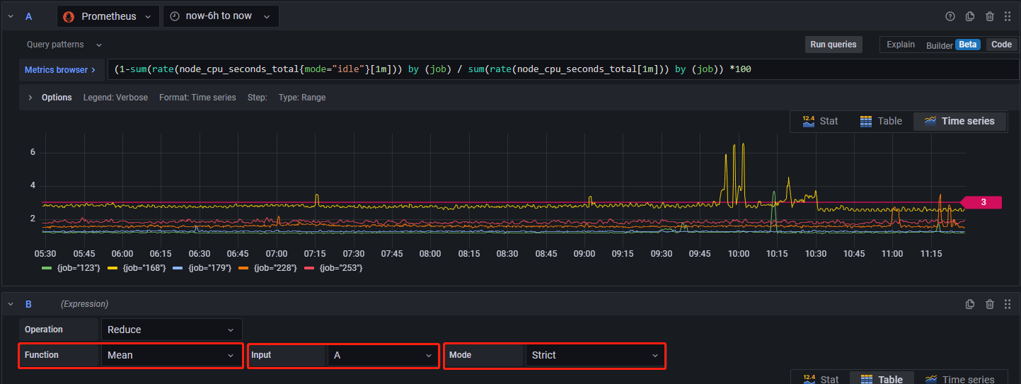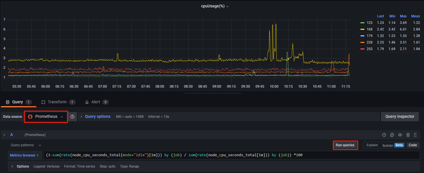 (1-sum(rate(node_cpu_seconds_total{mode="idle"}[1m])) by (job) / sum(rate(node_cpu_seconds_total[1m])) by (job)) *100在查询语句栏中输入上述代码,点击 Run queries,便可以获取 CPU 的使用率。