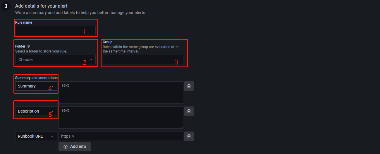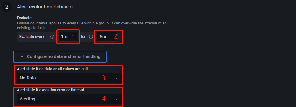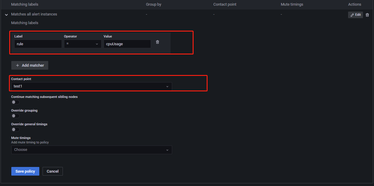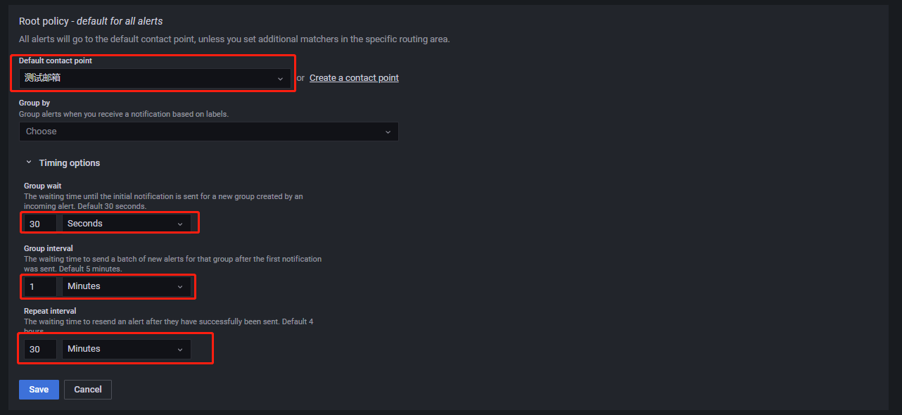 Default contact point为告警消息的默认接收者。Group by将告警规则按照所选择的Label进行分组。Group wait为新创建的告警规则所产生的新组在第一次发送告警消息前的缓冲时间。Group interval为属于同组的告警规则之间发送告警消息的时间间隔,举例说明:设组1有 A, B 两个告警规则,Group Interval 为 m 分钟,且他们的 Pending 时间都是 n 分钟,A 在9:45分触发了告警条件,B 在9:46分触发了告警条件,且 A 持续触发告警条件的时间大于 n,B 持续触发告警条件的时间大于 n+m,则 A 将在(9:45+n)发送告警消息,B 不是在(9:46+n)触发告警消息,而是将在(9:46+n+m)发送告警消息。