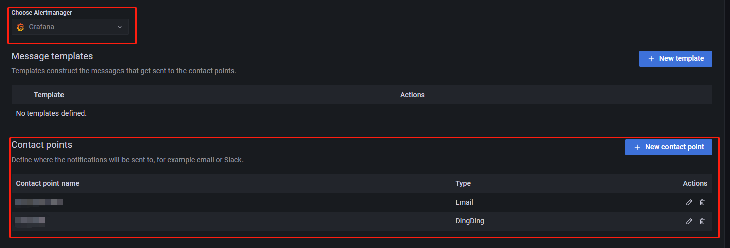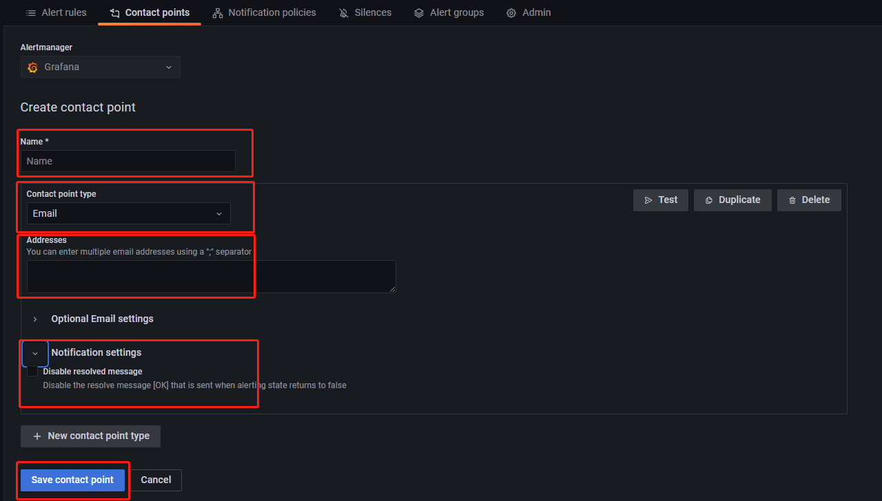 将Webhook复制下来,后面需要用到。然后回到 Grafana Alerting 页面,去 Contact points 模块里点击 New contact point,进入如下所示页面: